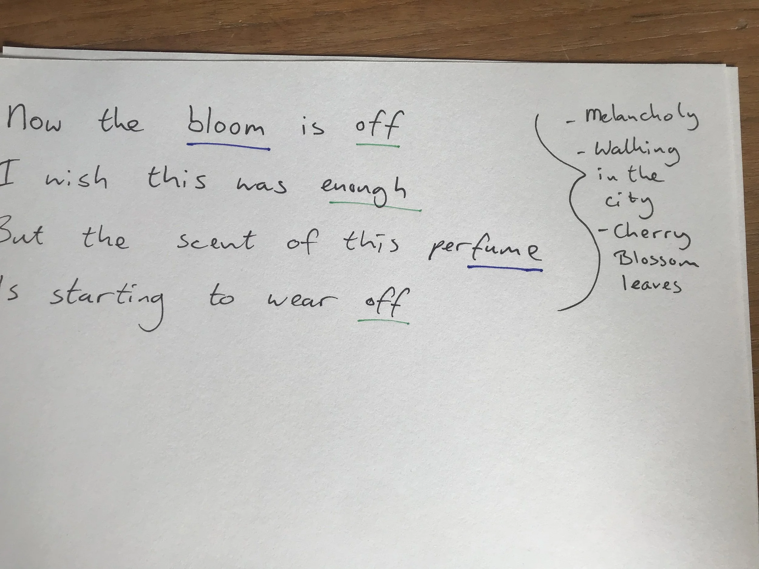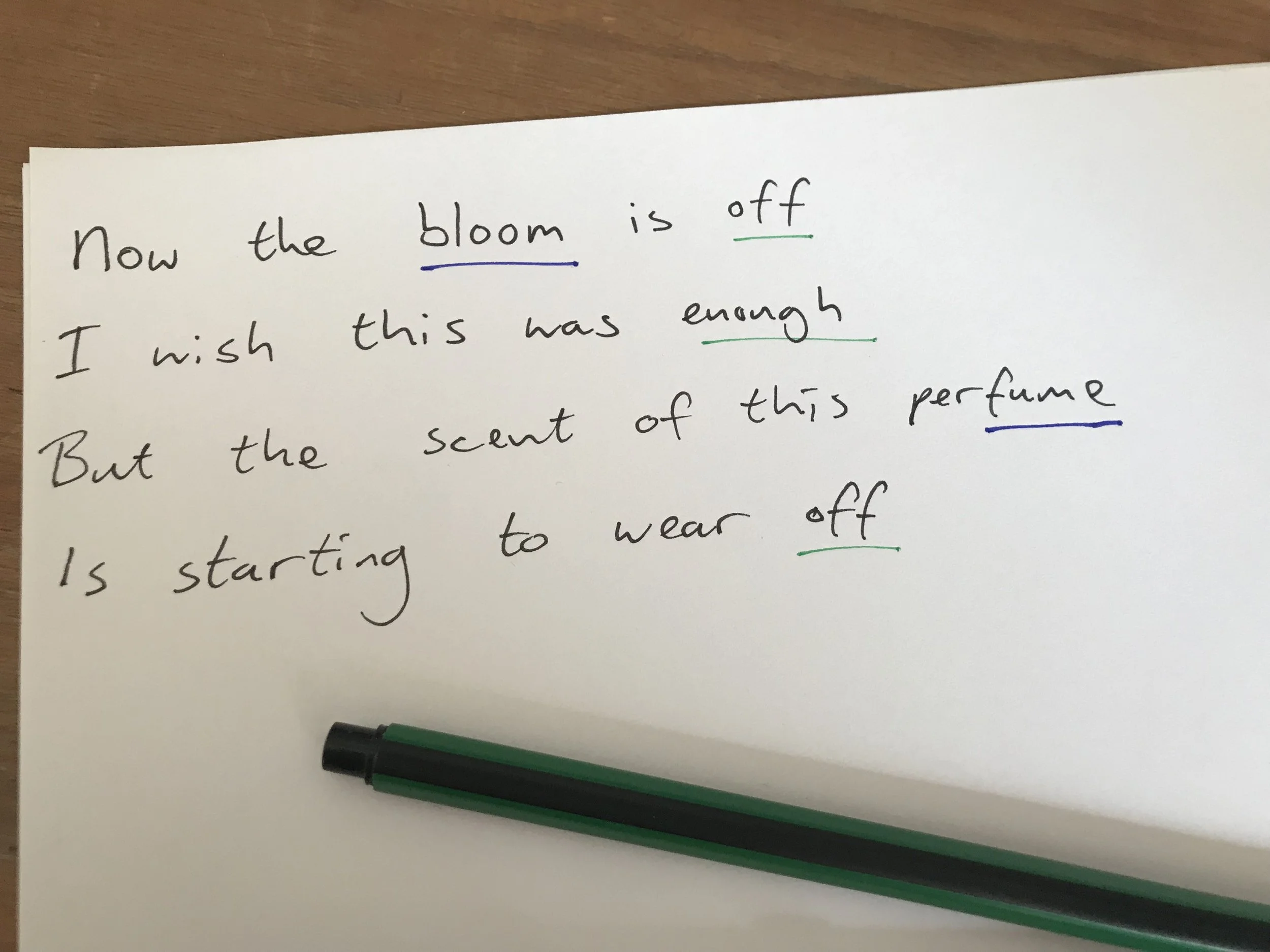 This is a verse of my own song “Cherry Blossom”. Bloom and perfume rhyme with each other, and the 2 “off’s” rhyme with enough.